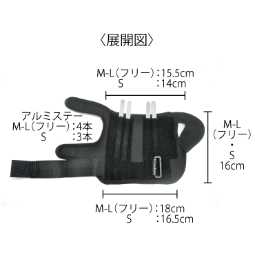 ■製品特徴・抜き差し可能なアルミステーで手首の固定レベルを段階的に調整できる・アルミステーは固定したい角度に合わせて形状を変えることができる・2本のストラップや切り替えしベルトでサポート力の調整が可能■こんな方にオススメ・手首をしっかり固定して動きを制限したい方・ギプスを外した後に不安を感じる方■サイズ(写真参照)【手首周囲】M-L(フリー):13~19cm、S:12~16cm【甲周囲】M-L(フリー):17~22cm、S:14~19cm【全長】指側(上部)M-L(フリー):15.5cm、S:14cm手首側(下部)M-L(フリー):18cm、S:16.5cm【丈】16㎝【アルミステー】M-L(フリー):4本、S:3本 ■カラーブラック■素材ナイロン、ポリエステル、ポリウレタン