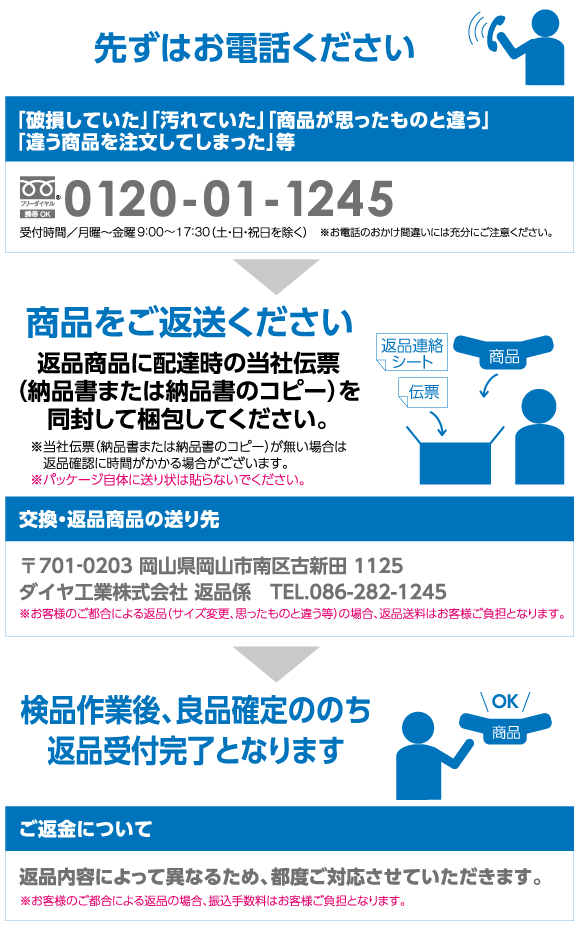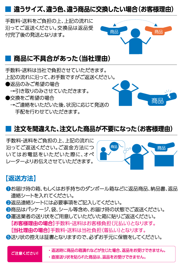 お届けした商品で万一ご満足いただけない場合は商品到着後10日以内であれば返品・交換を承ります。